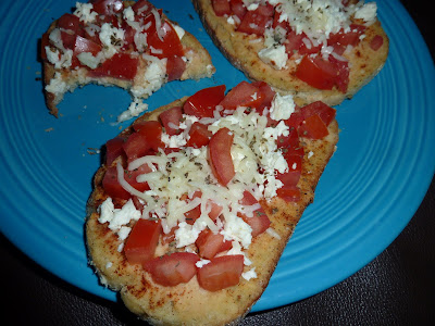 Paul and I eat this as an actual dinner-meal, but it also makes a great appetizer. Choose any type of bread that you like for this bruschetta. I picked up a loaf of spinach-feta bread from a local farmer's market and it really hit the spot. However, I doubt that I will find a loaf of bread like that again, so next time, I will use french bread or perhaps asiago bread....so many delightful choices ahead of me! :)
